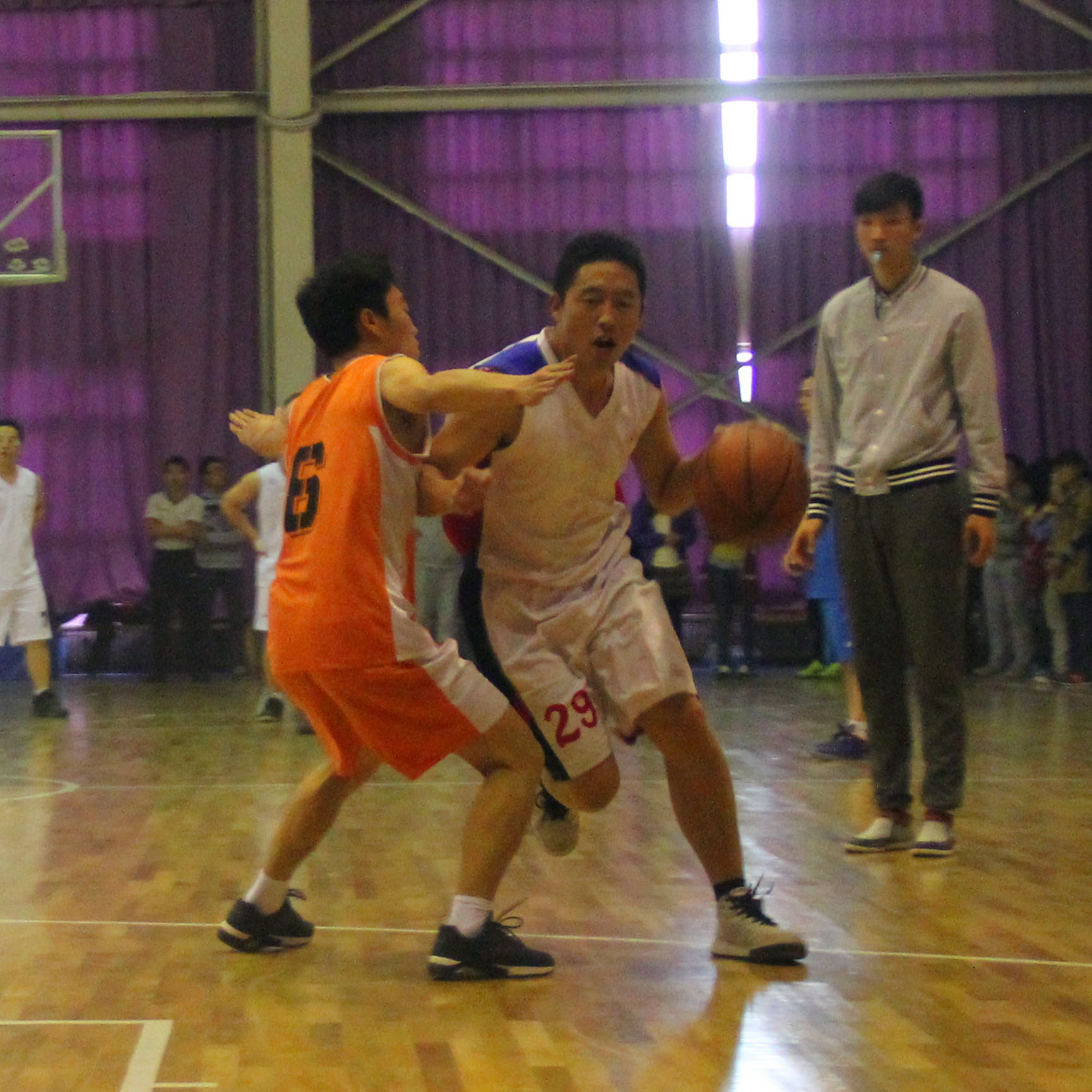 下半场伊始,图书馆加强进攻,试图扳回比分。但核院技高一筹,能里能外,内外结合,尤其在最后阶段,核学院以两记三分球点燃全场气氛,观众们欢呼雀跃,激动不已,呐喊声震耳欲聋,有的同学甚至还边跳边叫,场面异常激烈。