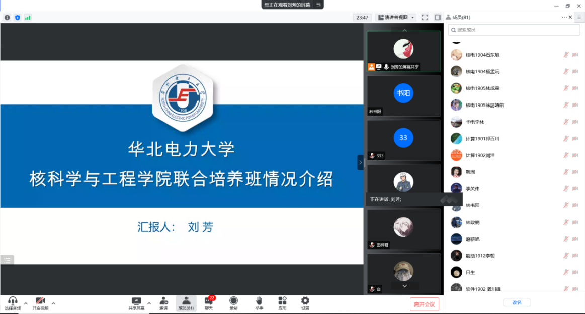 随后,刘芳对核学院校企联培班的发展概况、联培体系、联培计划、联培特色、联培成果等情况进行详细介绍。刘芳谈到,核学院创建的“订单+联合”校企联合人才培养模式,充分发挥校企合作资源优势,经过15年不断探索和创新,为核电企业培养了800多名优秀人才,受到了用人单位的广泛认可和一致好评,并被推广应用到全国各大高校的联培班,发挥了显著的引领、示范作用。